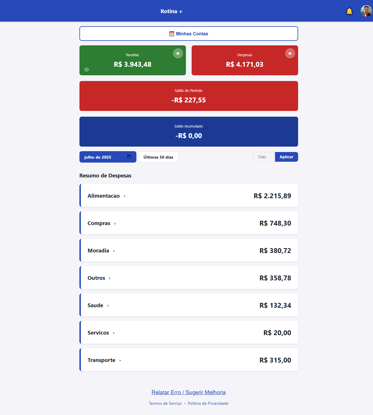 Desenvolvi este Sistema de Gestão Financeira (PWA) completo como um projeto para uso pessoal e para treinar minhas habilidades em desenvolvimento full-stack. A aplicação roda no Firebase, você pode acessar e testar em app.rotinaplus.com.br